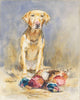 watercolor painting of a chocolate labrador retriever sitting looking directly at viewer with a duck at his feet